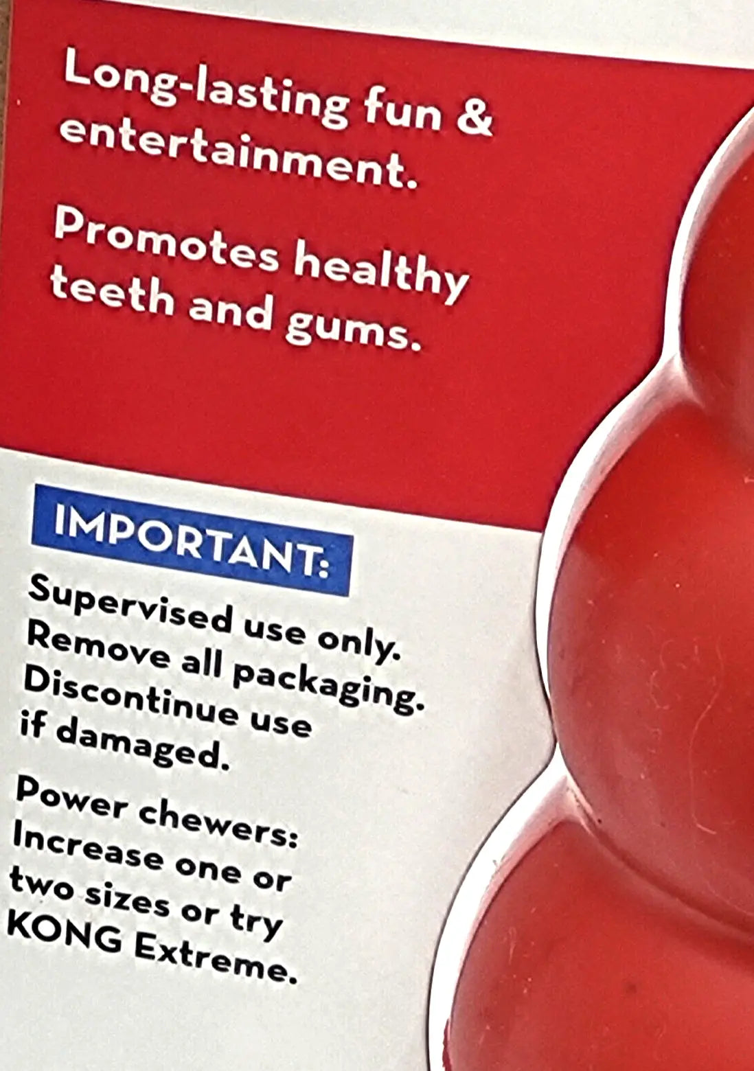 Every dog plays differently and, since not all toys are created equal, it’s always best to keep a close watch on your pup in case things get ruff. Supervised play will help toys last longer and most importantly keep your pal safe. No dog toy is truly indestructible, so always remove the toy from playtime if pieces begin to break off. Power chewers: Increase one or two sizes or try KONG Extreme.